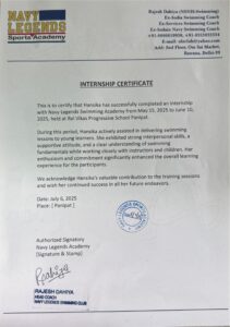 Swimming Instructor Intern | Navy Legends Academy May 2025- June 2025 | Bal Vikas Progressive school, Panipat
